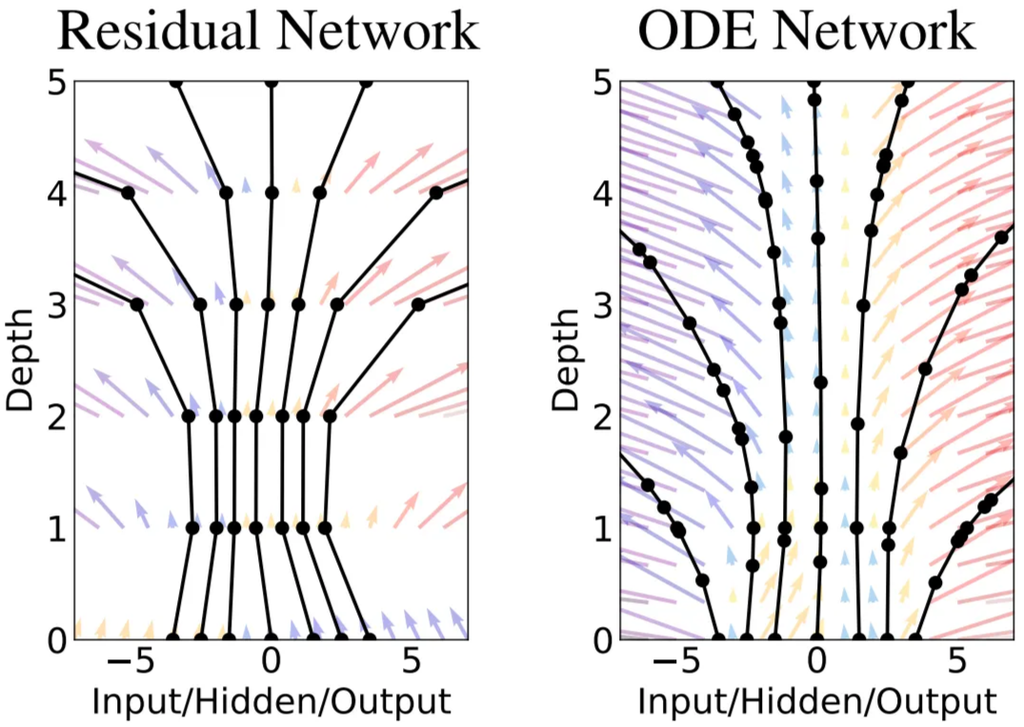 the Neural ODE paper (Chen et al.) made this connection explicit by observing that a residual network correspond to explicit Euler discretization of an ordinary differential equation: