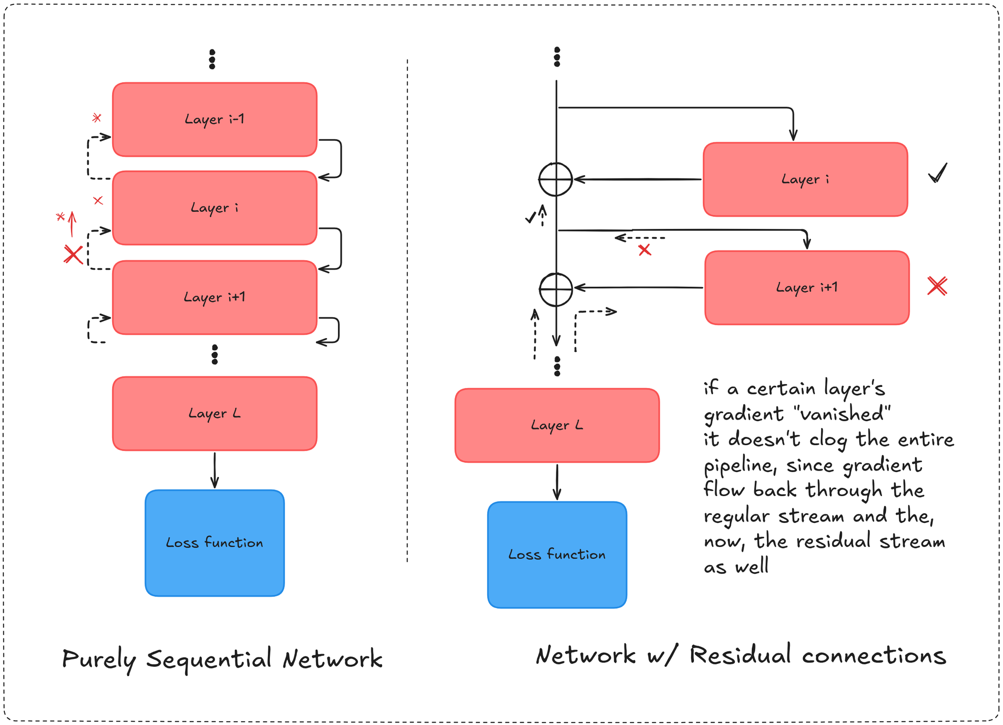 the high level intuition of residual connections is that, when training very deep networks (e.g MLPs), the change of one layer’s representation compared to the next would be less and less different and thus instead of fully learning the representation at layer we can simply learn the difference / change relative to layer representation.