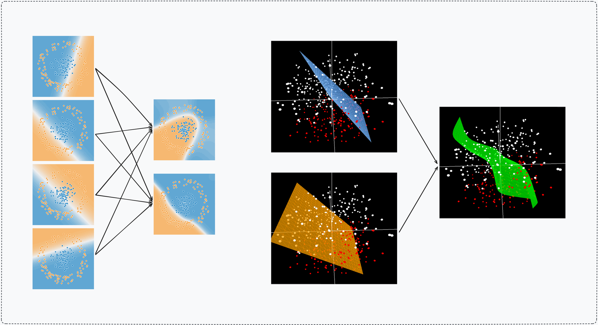 Activation functions (sigmoid, GeLU, …) enables this complexity, Without it, stacking layers would still produce linear boundaries. Each layer can warp and combine the boundaries of the previous layer, creating curves, loops, and arbitrarily expressive shapes drawn directly on the input canvas. The mental model remains anchored to the input space: we visualize a static data manifold with an increasingly intricate boundary cutting through it.