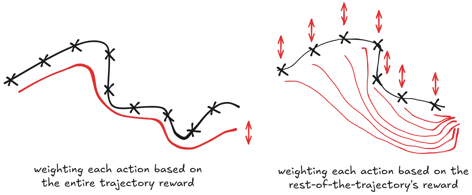 up-/down- weight the log-prob of the trajectory using it’s expected reward